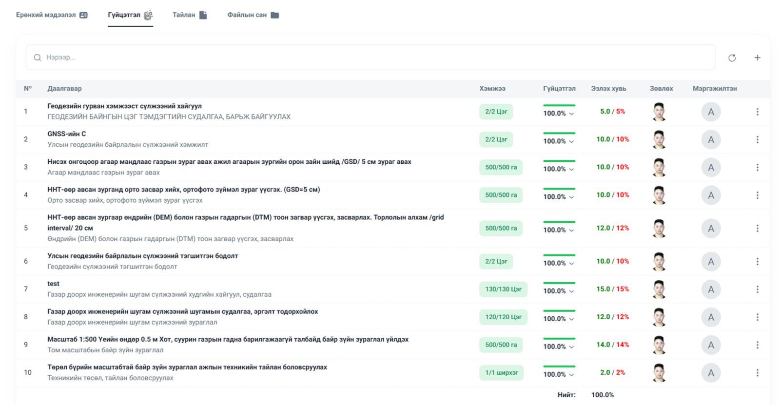 Энэхүү цахим системд гэрээт ажлын батлагдсан даалгаврын дагуу тайлангийн үе шат, ажлын бүрдэл, хэмжих нэгж, тоо хэмжээг нарийвчлан тусгаж бүртгэх бөгөөд системийн хэрэглэгч нь дараах эрх, үүргийг хариуцахаар хөгжүүлэгдсэн болно. Үүнд: