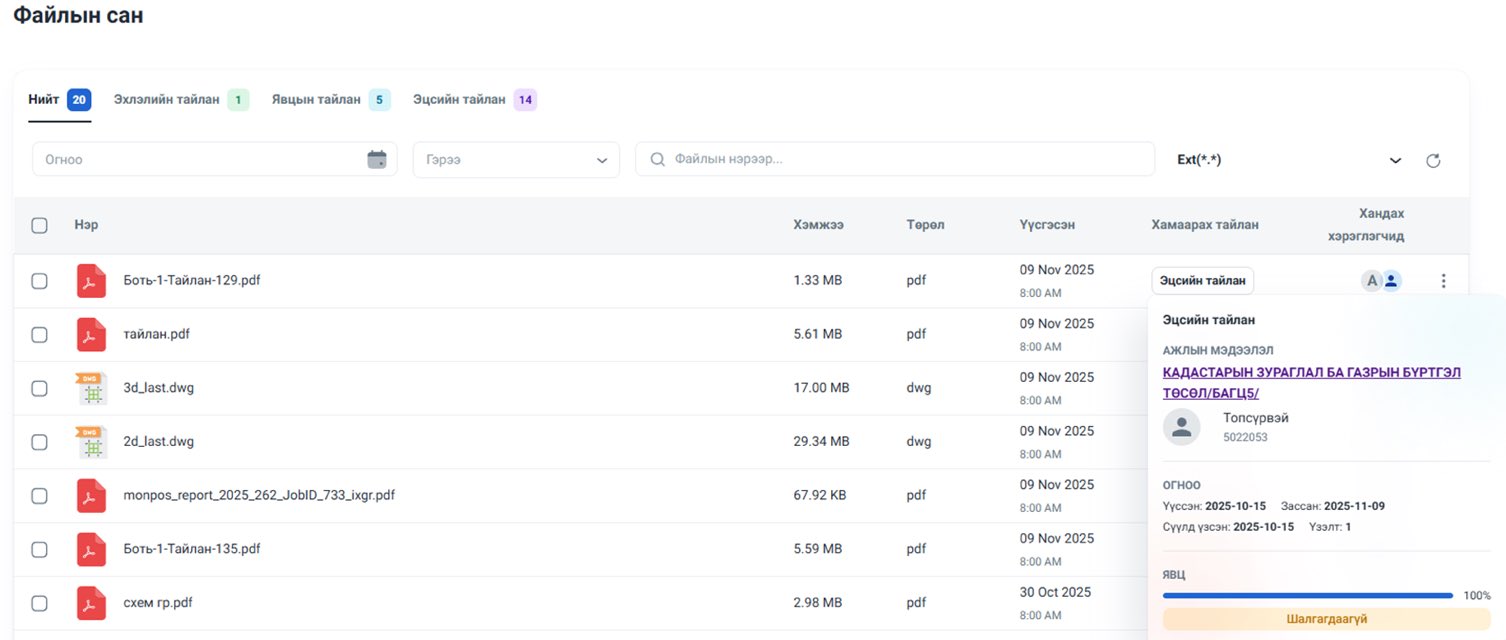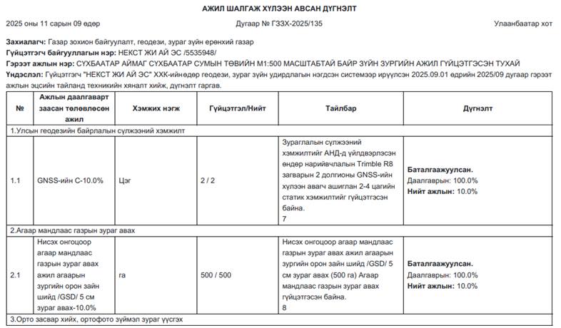 Захиалагчийн техникийн хяналт бүрэн хийгдсэн тохиолдолд Геодези, зураг зүйн ажлыг шалгаж хүлээн авсан цахим дүгнэлт /QR кодтой/ гүйцэтгэгчийн цахим шуудангийн хаягаар илгээгдэх ба дүгнэлт хэсэгт татаж авах төлөвтэйгөөр үүснэ. Энэ үе шатанд дүгнэлтээр баталгаажсан ажлын тоон өгөгдөлд хэрэглэгч болон захиалагч байгууллага хандах эрхтэй байна.