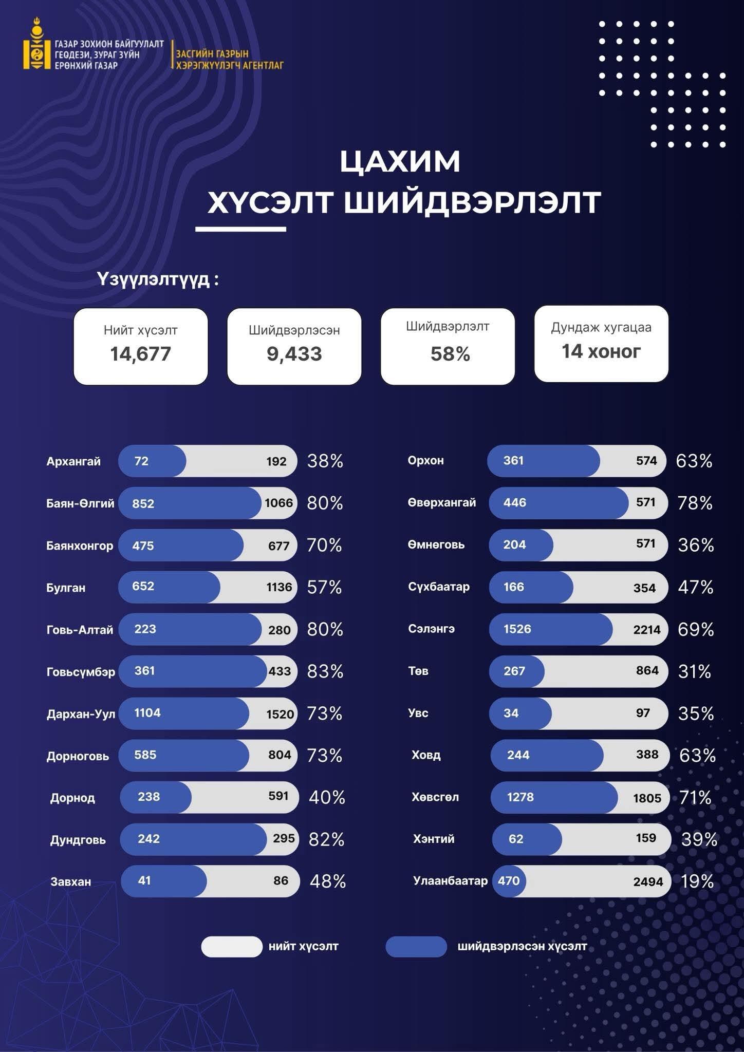 Дээрх хууль тогтоомжийн хэрэгжилтийг хянаж үзэхэд Улсын хэмжээнд иргэн, хуулийн этгээдээс нийт 14,677 хүсэлт цахим системээр дамжуулан хүлээн авсан байна. Үүнээс 9,433 хүсэлт шийдвэрлэгдэж, 2,065 хүсэлт буцаагдаж, 3,179 хүсэлт шийдвэрлэгдээгүй хүлээгдэж байгаа бөгөөд шийдвэрлэлтийн дундаж хугацаа 14 хоног байна.