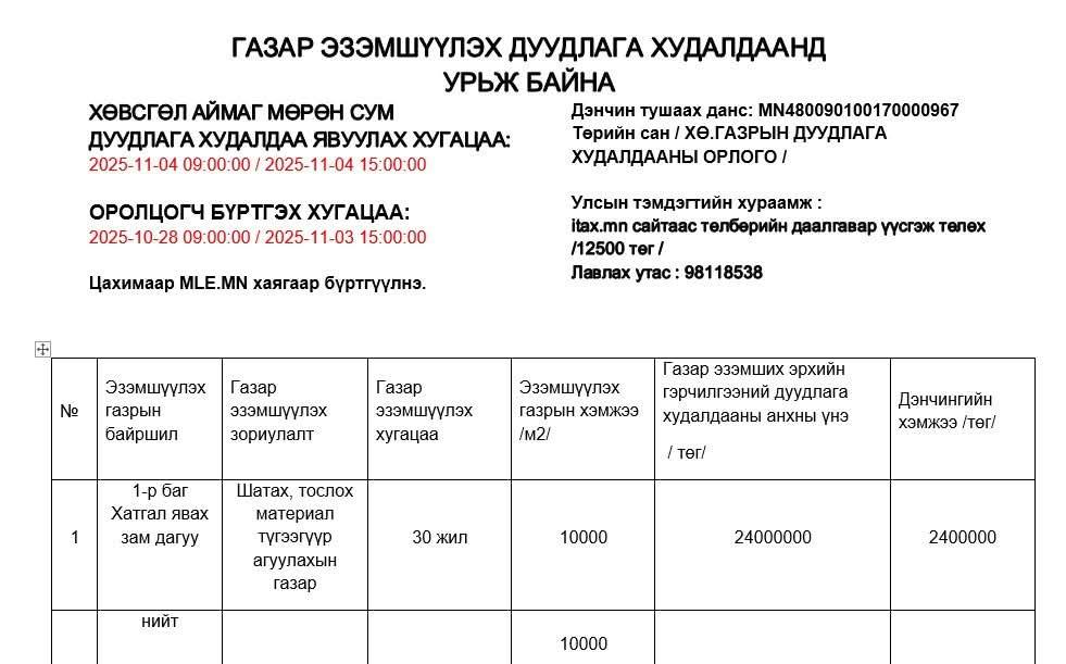 ГАЗАР ЭЗЭМШҮҮЛЭХ ДУУДЛАГА ХУДАЛДААНД УРЬЖ БАЙНА.