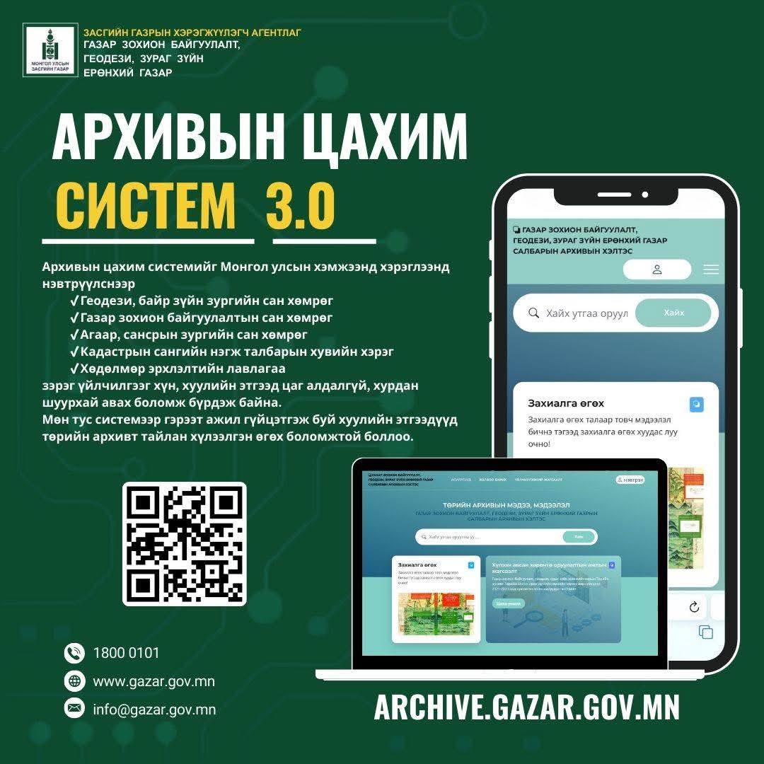 Газар зохион байгуулалт, геодези, зураг зүйн ерөнхий газрын төрийн архив, салбарын хэмжээнд үүссэн цахим архивыг хүн, хуулийн этгээдэд түргэн шуурхай, хүртээмжтэй хүргэх, архивын нөхөн бүрдүүлэлтийн үйл ажиллагааг цахимжуулах зорилгоор Архивын цахим систем (www.archive.gazar.gov.mn)-ийг шинэчлэн хөгжүүлж, хэрэглээнд нэвтрүүллээ.