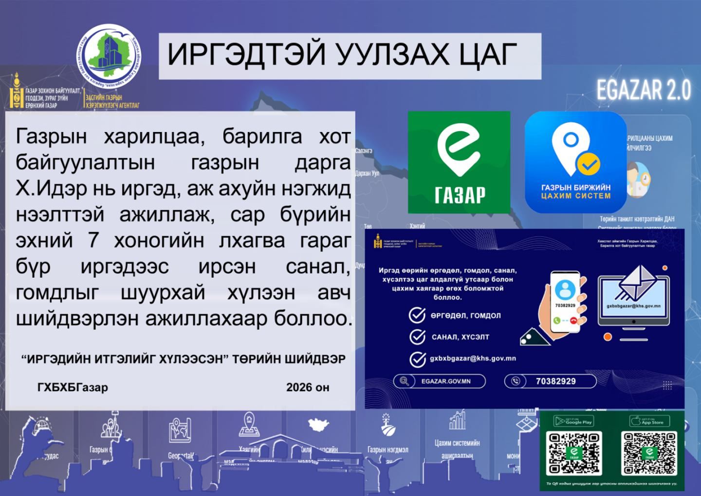 Газрын харилцаа, барилга хот байгуулалтын газрын дарга Х.Идэр нь иргэд, аж ахуйн нэгжид нээлттэй ажиллаж, сар бүрийн эхний 7 хоногийн лхагва гараг бүр иргэдээс ирсэн санал, гомдлыг шуурхай хүлээн авч шийдвэрлэн ажиллахаар боллоо.