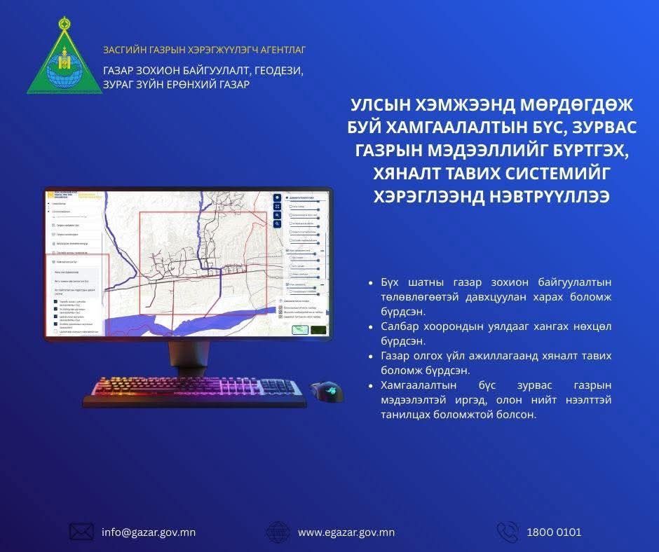 УЛСЫН ХЭМЖЭЭНД МӨРДӨГДӨЖ БУЙ ХАМГААЛАЛТЫН БҮС, ЗУРВАС ГАЗРЫН МЭДЭЭЛЛИЙГ БҮРТГЭХ, ХЯНАЛТ ТАВИХ СИСТЕМИЙГ ХЭРЭГЛЭЭНД НЭВТРҮҮЛЛЭЭ.