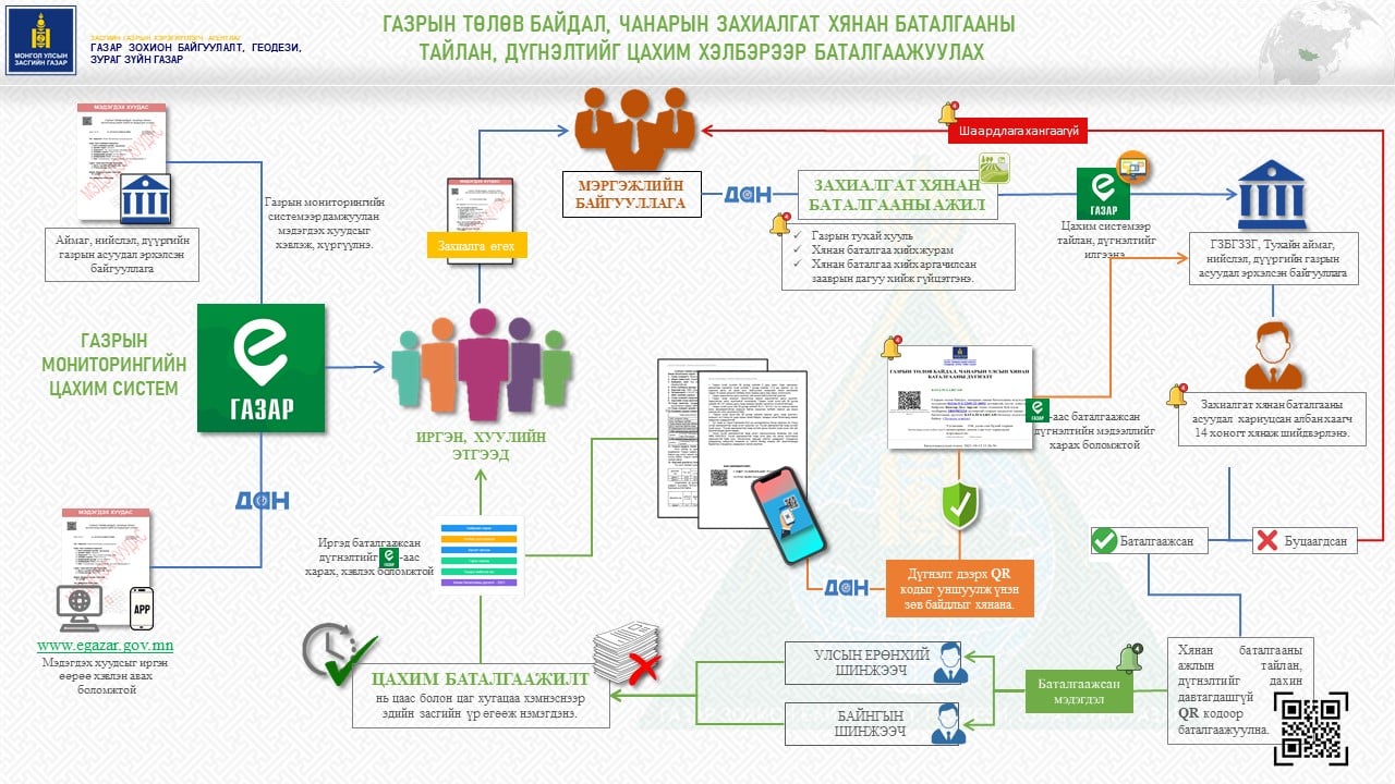 Газрын мониторингийн цахим системээр дамжуулан улсын ерөнхий шинжээч болон байнгын шинжээч нь захиалгат хянан баталгааны ажлын дүгнэлтийг дахин давтагдашгүй “QR” кодоор баталгаажуулж, баталгаажсан дүгнэлтийг www.egazar.gov.mn хаягаар дамжуулан иргэн, хуулийн этгээд, мэргэжлийн байгууллага, бусад төрийн байгууллагууд цахим хэлбэрээр харах, хэвлэх боломжтой боллоо. Ингэснээр захиалгат хянан баталгааны үйл ажиллагааг илүү хялбар болгож цаг хугацаа, эдийн засгийн хэмнэлтийг бий болгох зэрэг боломжийг бүрдүүлээд байна.